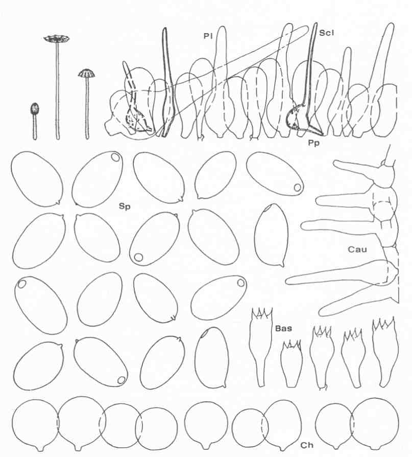 Huttrama: verzweigt, (Gitter-Typ) Pilozystiden: schlank, flaschenförmig, bis 95/ -21/ -5 um Sclerozystiden: vorhanden Cheilozystiden: rundlich Pleurozystiden: fehlen Basidien 4- sporig Sporen: bis 10,5 (11)/ -5,8/ -6,5 um Porus: etwas undeutlich, seitlich im Profil |