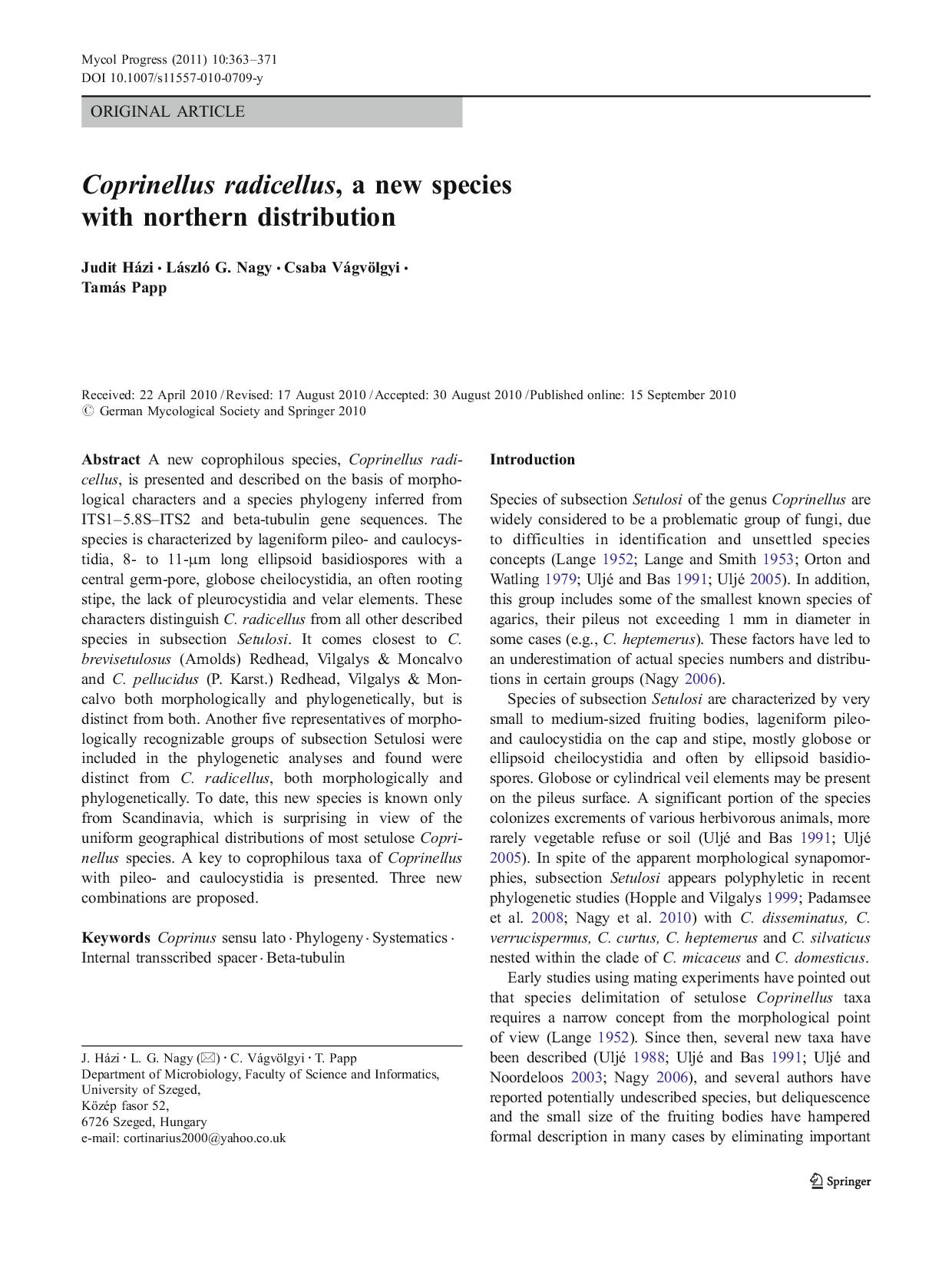 | Coprinellus radicellus | Házi, L. Nagy, Papp & Vágvölgyi 2011 | |||