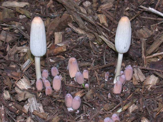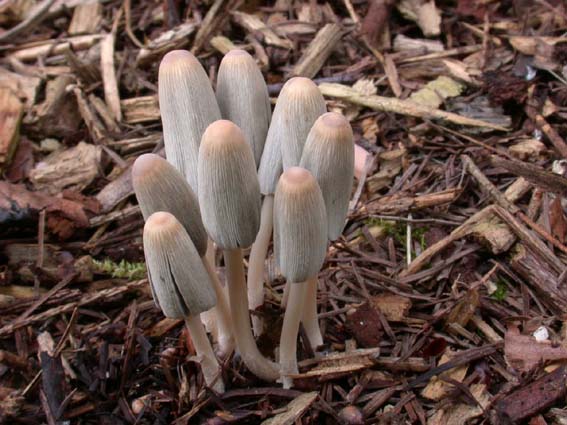 Coprinus lilatinctus der lilagetönte Tintling wächst meist auf Holzhäcksel.