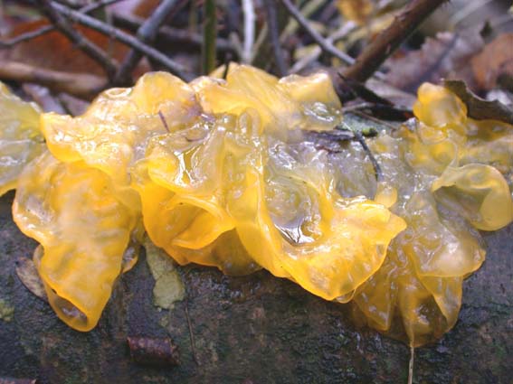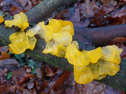 Der Goldgelbe Zitterling wächst bei längerer Feuchtigkeit das ganze Jahr hindurch an verschiedenen Laubhölzern.