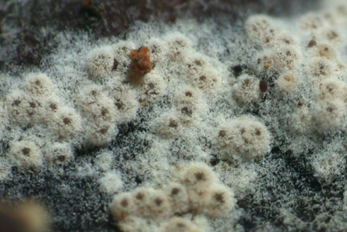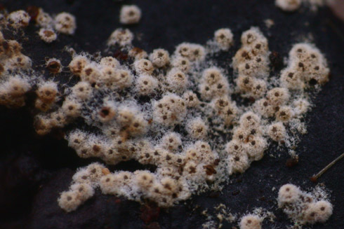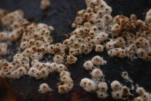 auf Fruchtkörpern von ziemlich altem Stereum rugosum auf