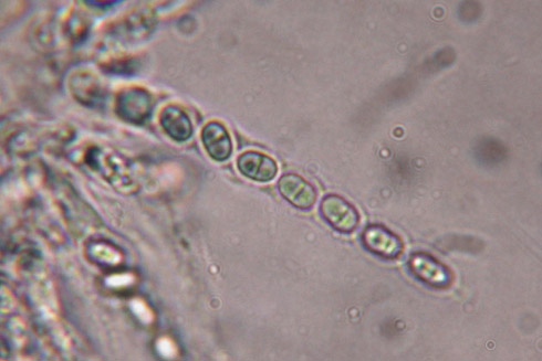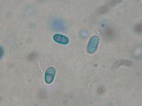 Sporen - 5,5 x -2,5 ym, mit 1 Septe, sehr fein punktiert, Paraphysen fädig, -1