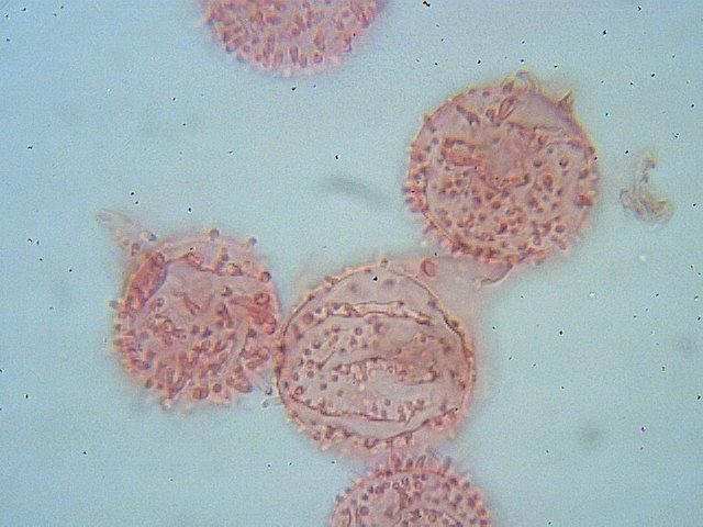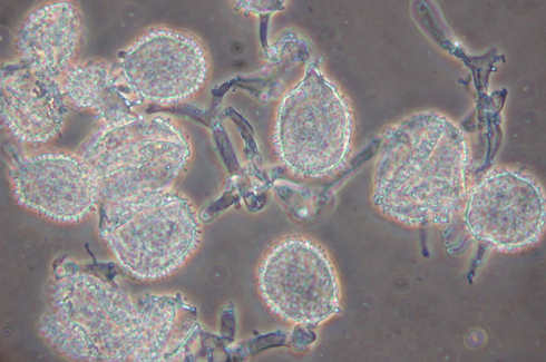 Hutvelum: rundlich bis birnenförmig, noppig, 17 - 45µm, dazwischen mit