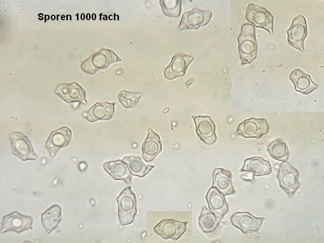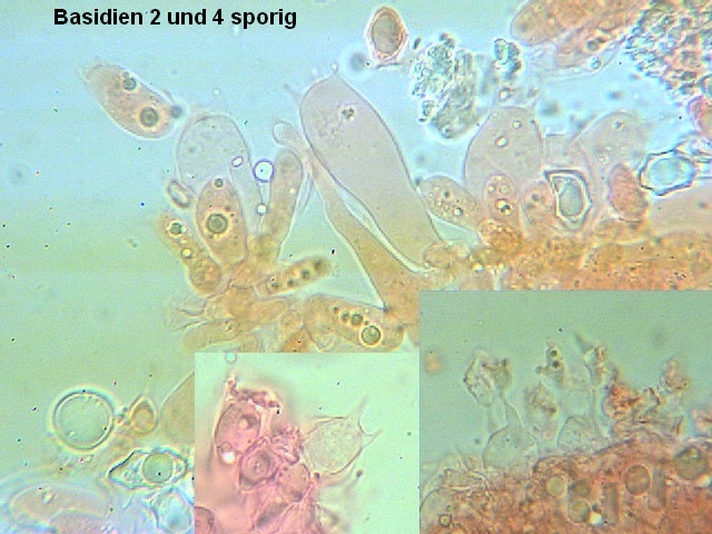 Mikrofotos Karl Wehr / Basidien 2 + 4- sp, Sporen 10 - 11,8 - 13,7 (14,1) x 6,5 - 7,4 - 8,3 µm, deutlich heterodiametrisch Q = 1,32 - 1.89 |