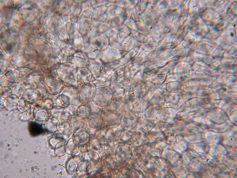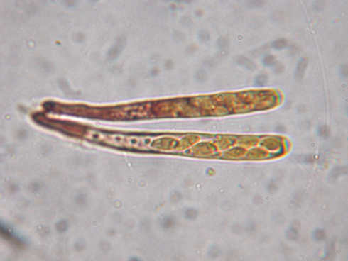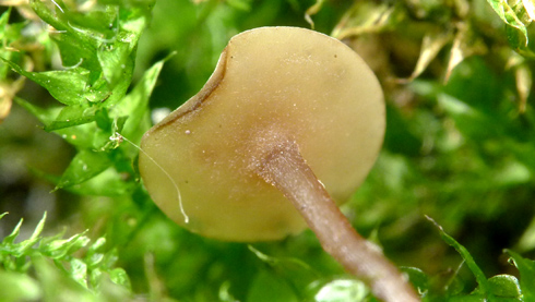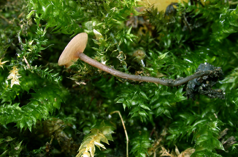 1 Fruchtkörper zwischen hohen Brennnesseln am Boden bei Moos.