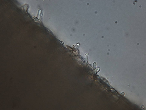Außenzellen kurzzellig- zylindrisch, 6-9µ breit, am Hutrand schmaler 4-5µ breit, stumpf abgerundet bis z.T. schwach keulig. leg. det. Bender, conf. Zotto