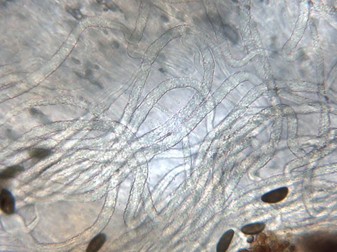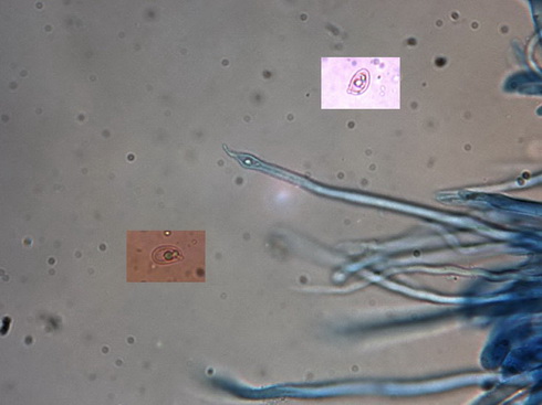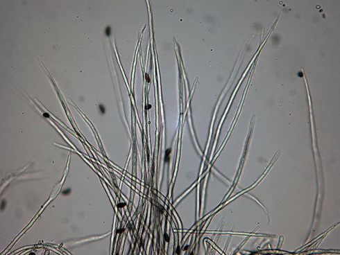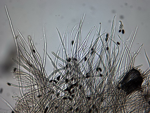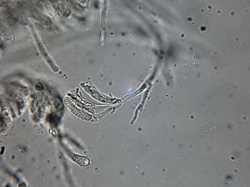 Sporengröße: 7,5 - 8,0 x 4,3 - 4,6µ Auf Grund der Merkmalskombinationen kommt dieser Fund Flagelloscypha orthospora am nächsten, weicht aber hinsichtlich des Typus-Substrats (an Blättern von Verbascum) leicht ab. Agerer (1979) gibt allerdings „Farne, Blätter, Holz und Borke“ an.