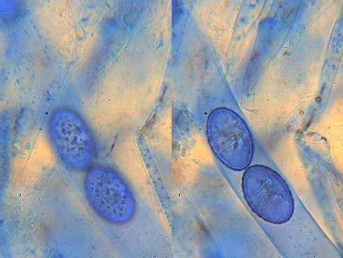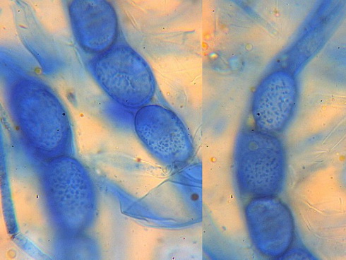 Sporen: breit elliptisch, mit isolierten, teilweise zusammenlaufenden, flachen Warzen; 22 – 24,5 x 14 – 16 mµ in Wasser