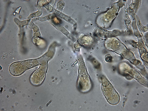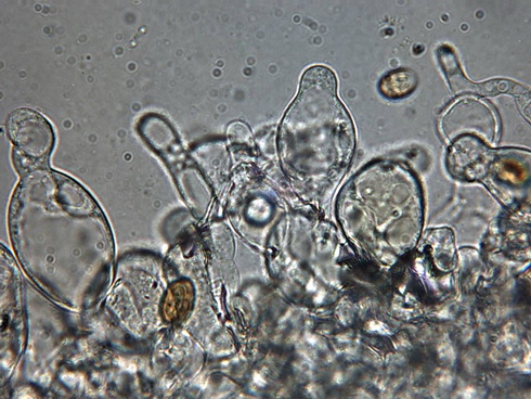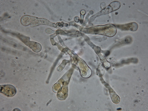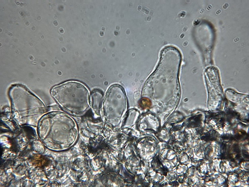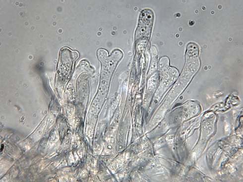 Die Cheilozystiden sind überwiegend rundlich oder mit Fortsatz sowie breit flaschenförmig, schlanke flaschenförmige sind selten!