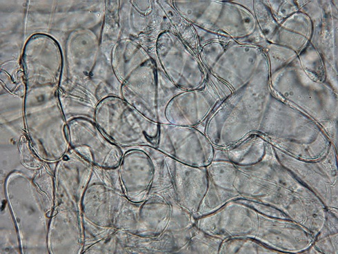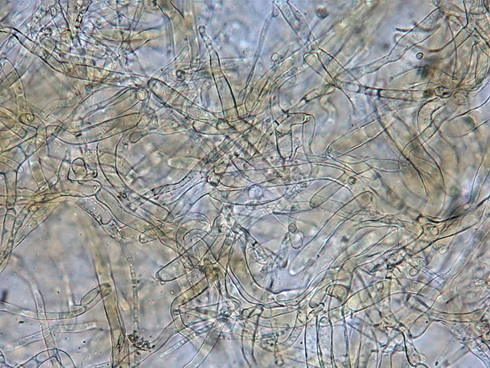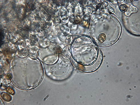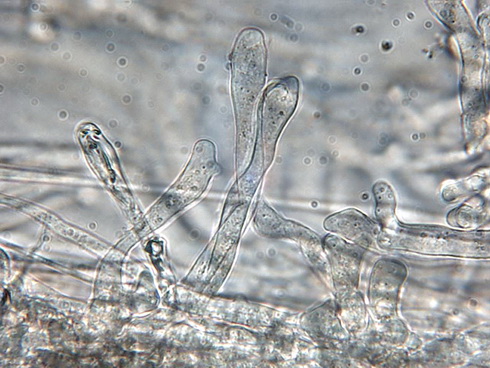 HDS: schlank bis breitkeulig, oft knorrig mit Verzeigungen im oberen Bereich, oft mit olivfarbenen körnigen Inhalt, bis 20 µm breit,