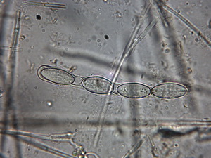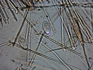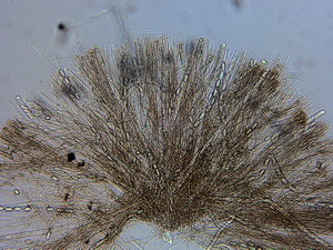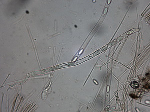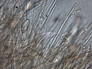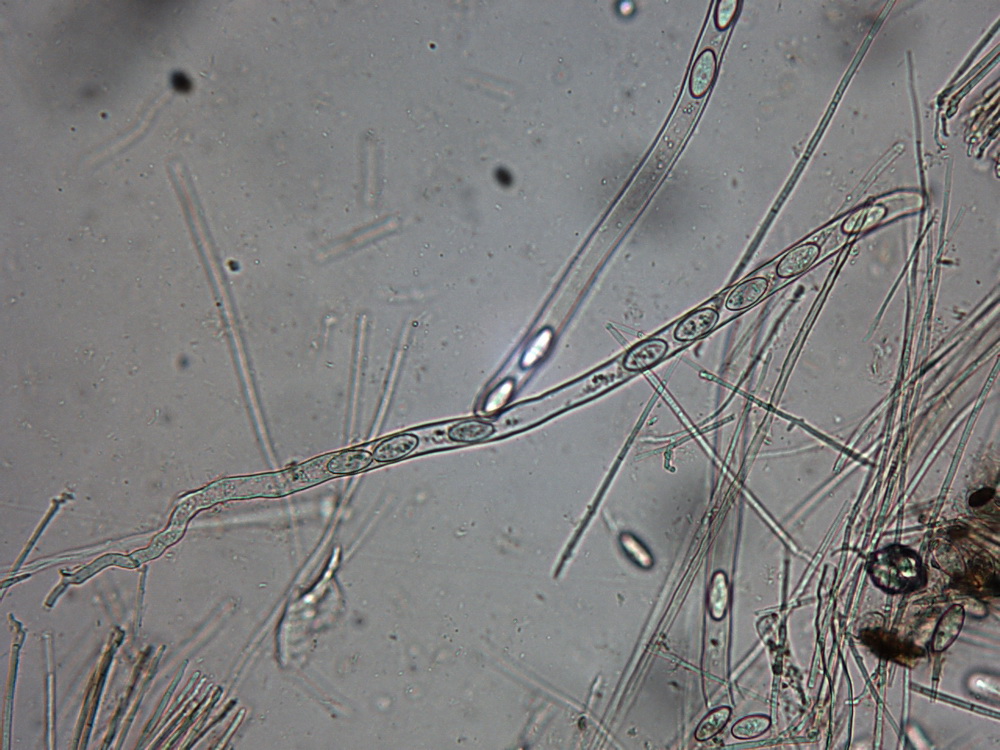 Die Fruchtkörper wuchsen an kleinen Ästen am Boden.