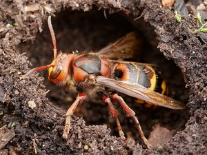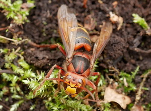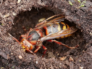 Aus einem alten liegenden Pappelstamm krabbelte eine Königin aus dem Winterquartier.