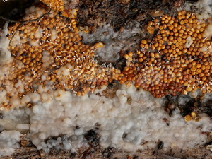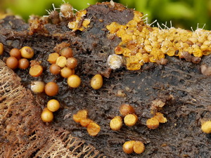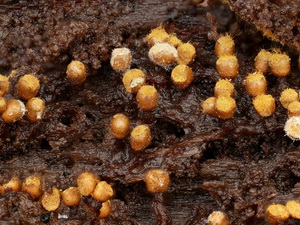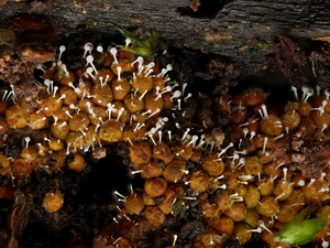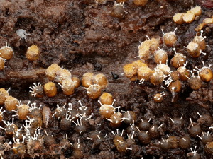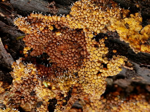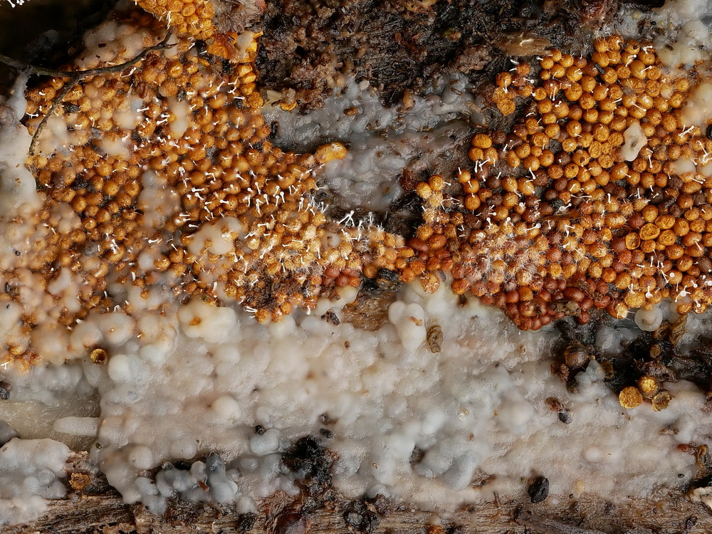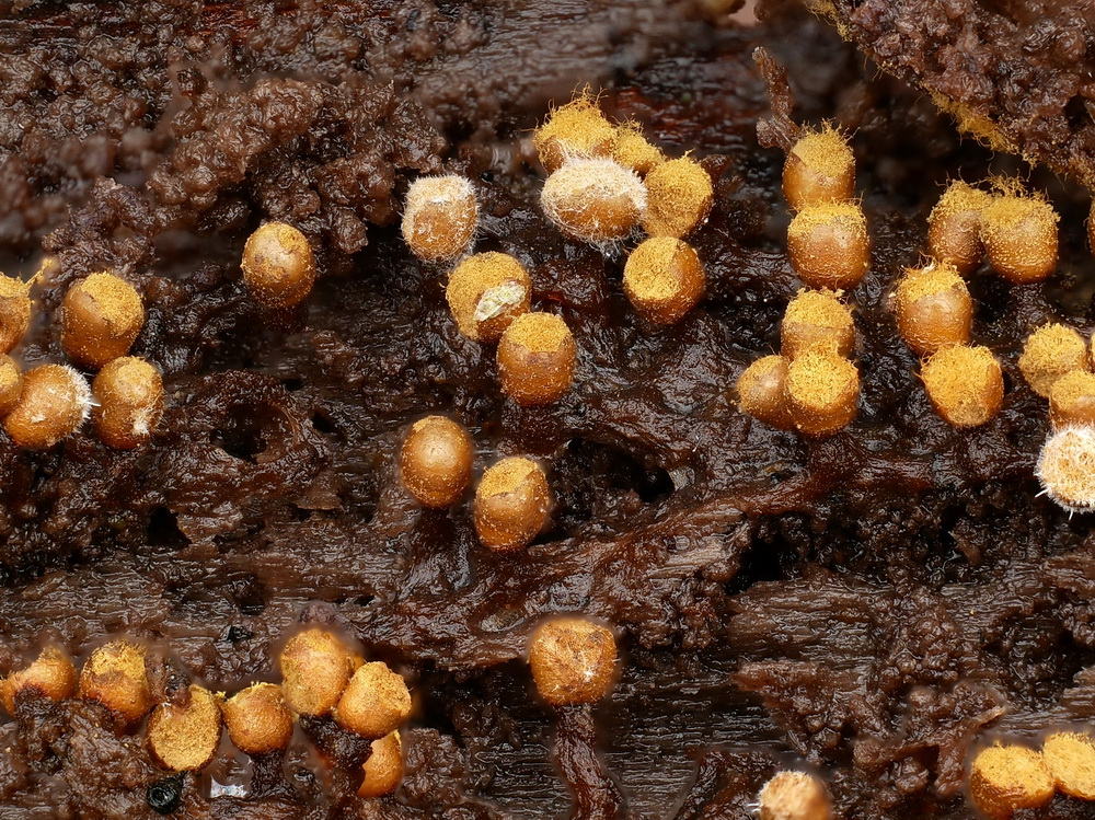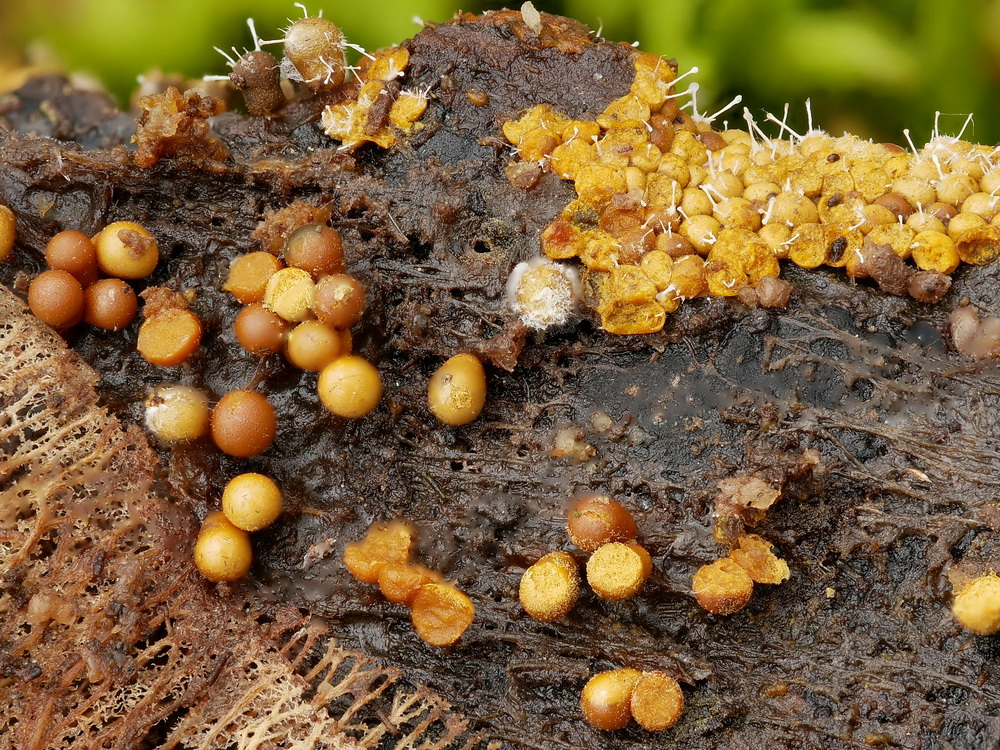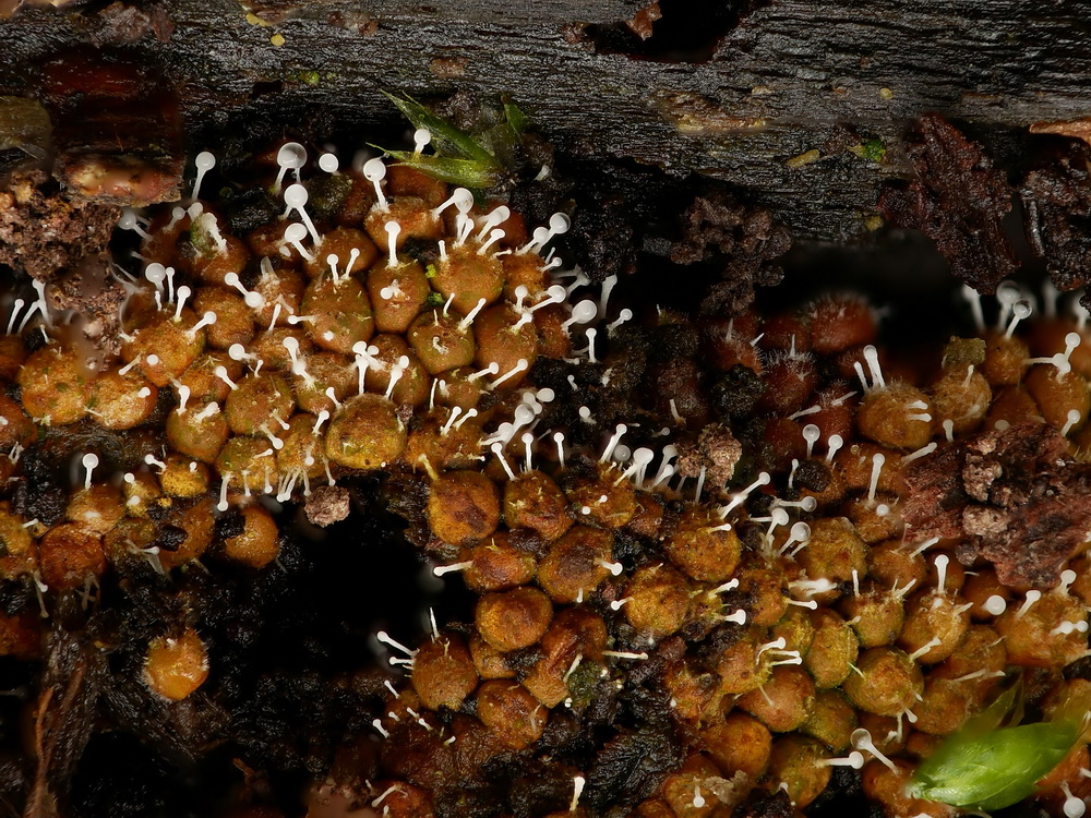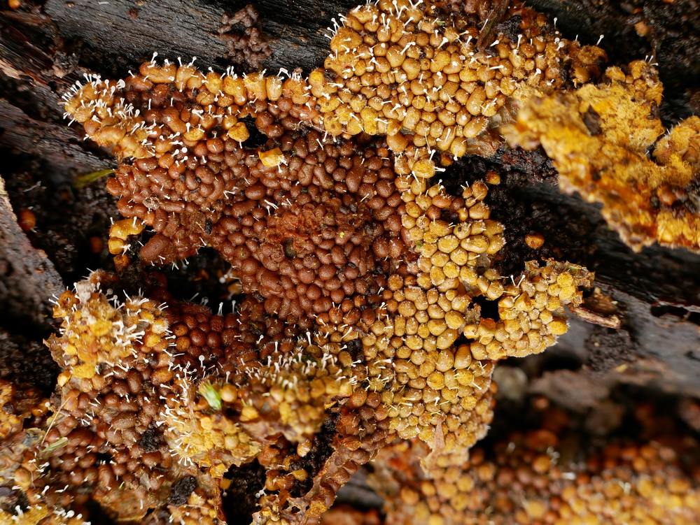 Polycephalomyces tomentosus befällt ausschließlich Schleimpilze (Myxomyceten)