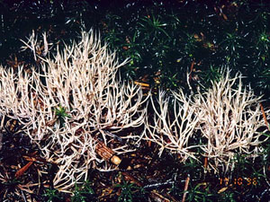 Die Frk. waren an den Wurzen miteinander durch Moos verbunden oder wuchsen auch oberirdisch direkt aus einzelnen Moosteilen.