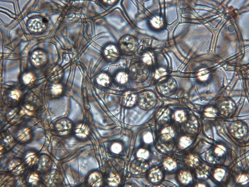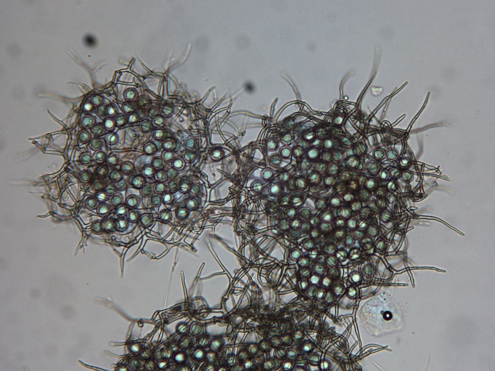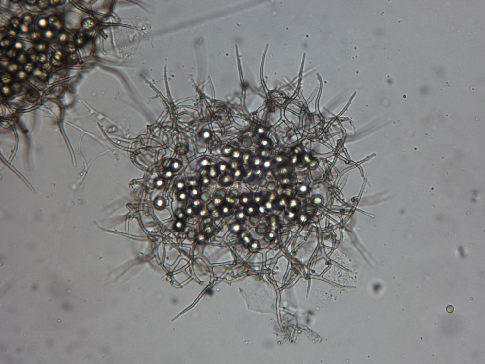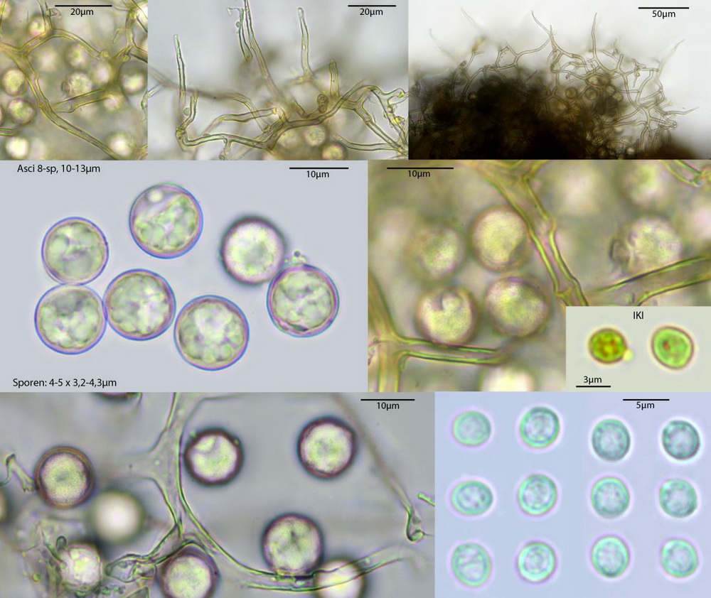 Die Asci sind jetzt wohl eindeutig 8-sporig. Unreife Asci täuschen 16 bis 32 sporige Asci vor, beim Quetschen dieser Asci entweichen eine Unmenge runde blasenartige kleine und größere Tropfen. Wie diese Entwicklung zur Sporenreife führt, hat sich mir noch nicht erschlossen. Nur in wenigen Fällen, kommt es aber zu Sporenreife! Die Sporenform tendiert von fast rundlich bis leich oval. Die Sporenornamentation ist meist nur selten zu beobachten, weil wohl der natürliche Reifprozess bei der Zucht nicht richtig gegeben ist.