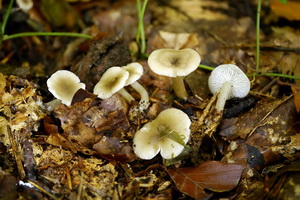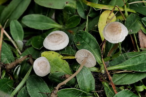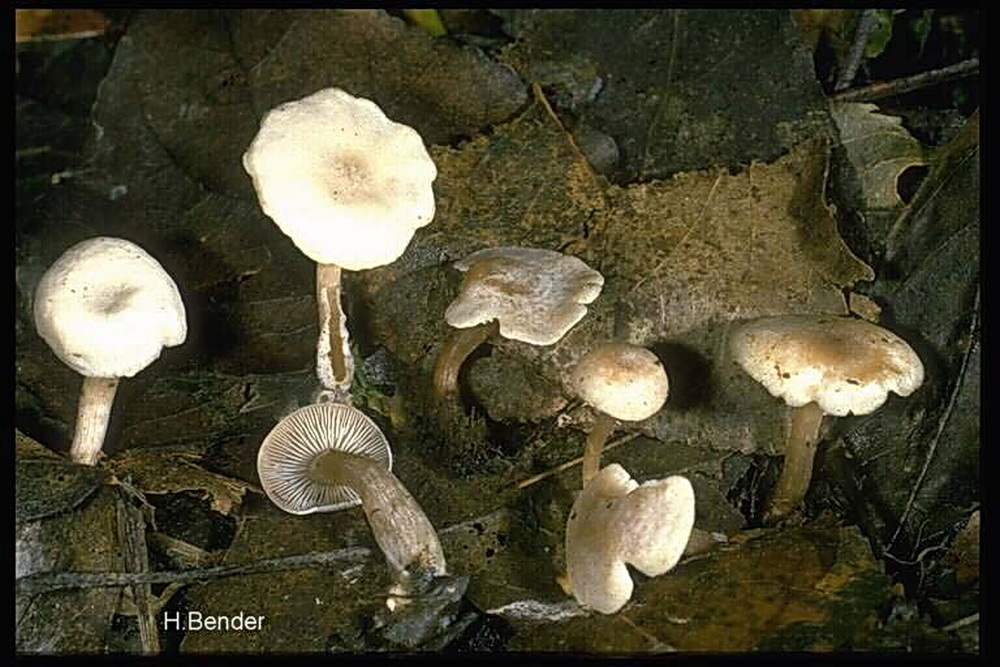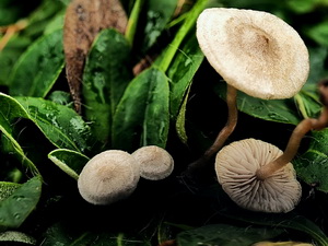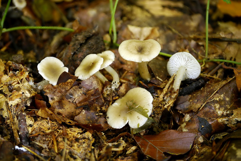 Lyophyllum platypum wächst spät bis in den Winter auf Blättern.