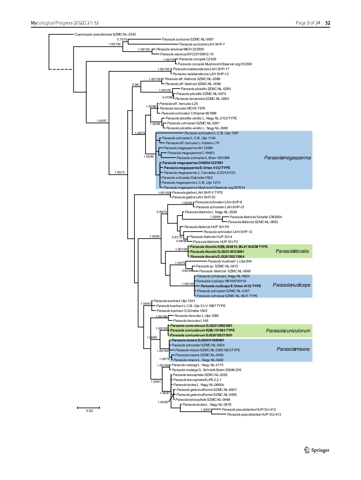 Die Sequenzierung eines Altfundes von mir (HB19870911A; 11.09.1987; Kandelberg; MTB 8013) hat jetzt gezeigt, dass es sich bei (Coprinus) Parasola nudiceps um eine von Parasola schroeteri verschiedene Art handelt. Die Sequenz ist identisch mit der inzwischen neu beschriebenen Parasola ochracea L. Nagy, Szarkándi & Dima welche wegen fehlender Pleurozystiden neu beschrieben wurde. Offensichtlich wurden die Pleurozystiden jedoch lediglich übersehen, da mein Fund von Parasola nudiceps mit der gleichen Sequenz Pleurozystiden hatte.